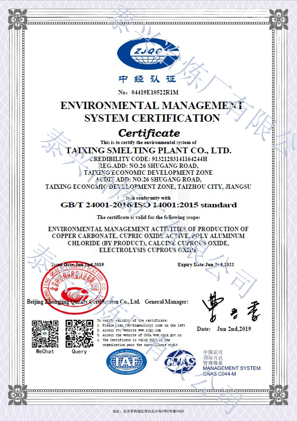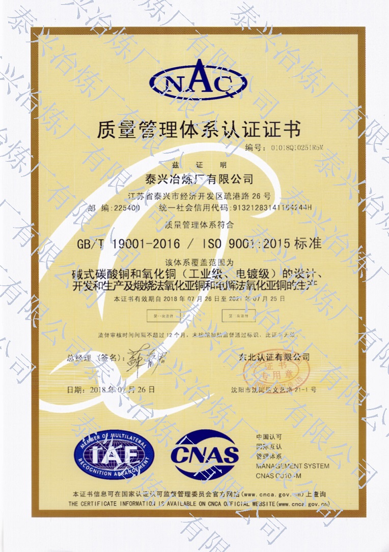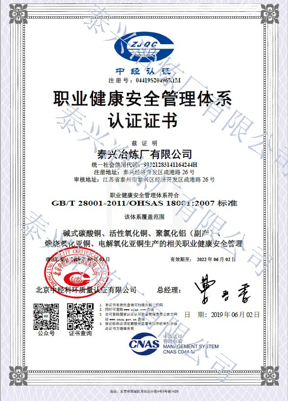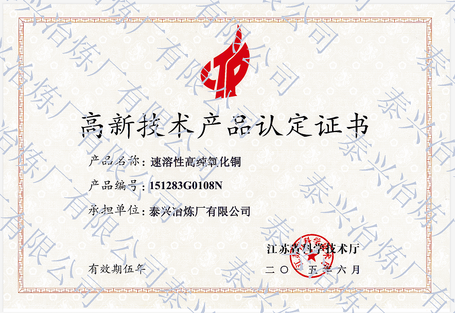 泰興冶煉廠有限公司(原泰興冶煉廠),始建于20世紀(jì)70年代初,現(xiàn)位于江蘇省泰興經(jīng)濟(jì)開發(fā)區(qū)。歷經(jīng)40年的創(chuàng)新驅(qū)動、穩(wěn)健發(fā)展,已成長為一家專業(yè)生產(chǎn)堿式碳酸銅、高純電鍍氧化銅、氧化亞銅、氧化銅、無水硫酸銅、海綿銅粉及副產(chǎn)品聚氯化鋁(凈水劑)等系列無機(jī)鹽產(chǎn)品及處置不含氨的氯化銅蝕刻液(HW22)15000噸/年的“國家高新技術(shù)企業(yè)”和地方性骨干企業(yè)。公司總占地面積3.7萬平方米,建筑面積4萬平方米,注冊資本2088萬元,固定資產(chǎn)1.2億元,年產(chǎn)值約7億元。